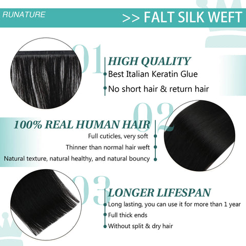 Flat silk weft is a thinning form of human hair wefts. To avoid the hair shedding problem, manufacturers add double-stitched to make it firmer. In other words, this hair is a weft sealed by a super-thin piece of silk base. Often, these flat silk weft hair extensions are thin flat, about 1mm in thickness and 10mm in width. The hair extensions are utterly safe to attach to your head as they have no silicone and are made of pure human hair. All cuticles are kept intact, mimicking the look of your natural locks.